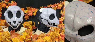 Glitter skulls are slush cast glitter layers with the last layer being a deeply dyed color to match the glitter, with a layer of black behind that for anti-glare inside the mask.